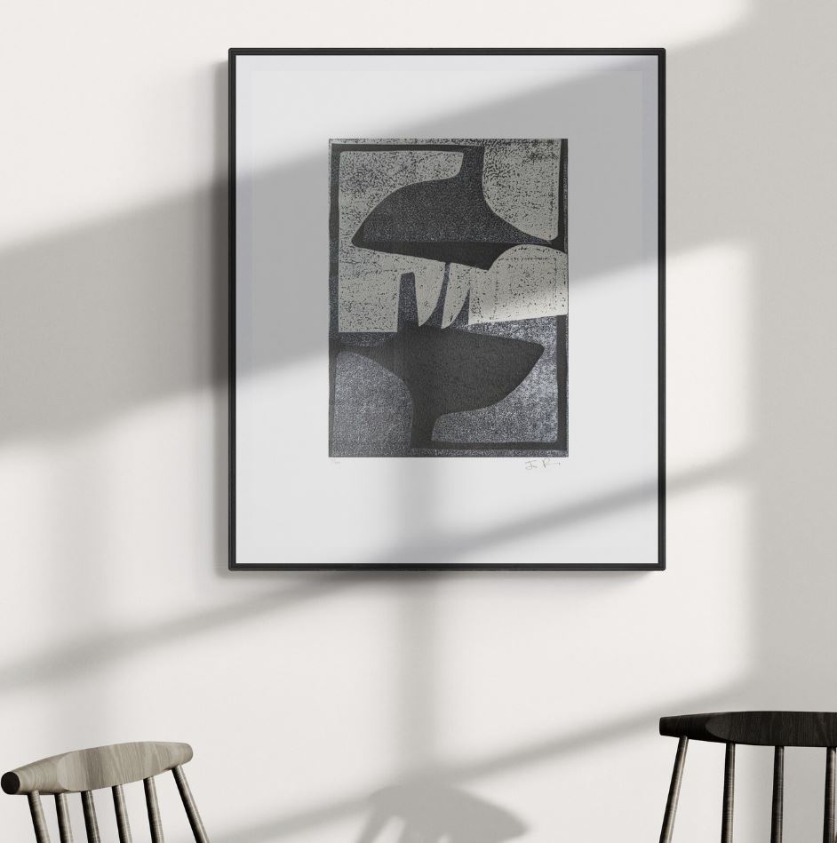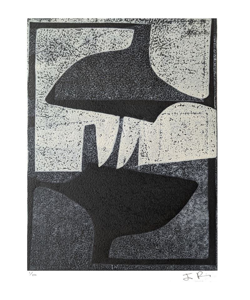 “Reflexive Forms” – I’ve been drawn to printing white over black for a while. There’s a depth in the greys where the white fails to fully cover, letting the black recede. This creates a layered sense of presence, of something lingering just beneath the surface, half seen in the dark.
